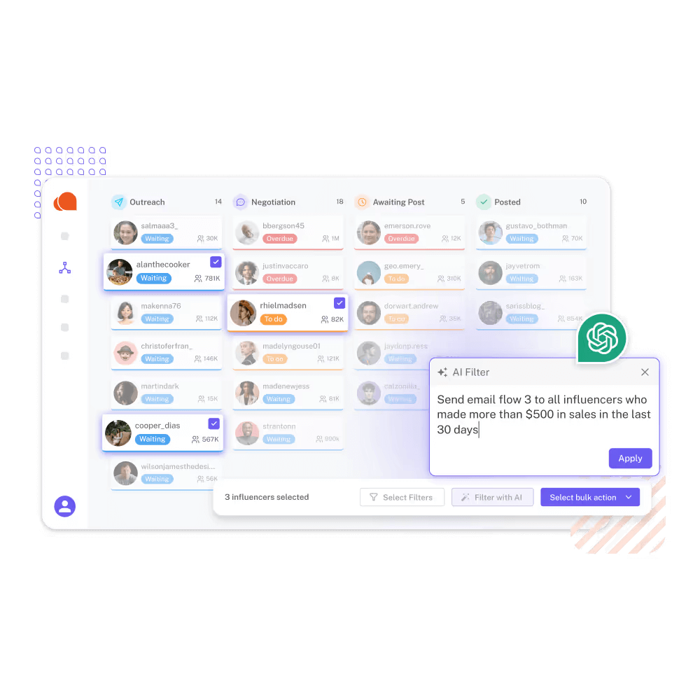 Smart deal selection and bulk actions: Select multiple creators using filters or AI prompts like “Creators with over $100 in sales.” You can also apply updates across many deals at once like sending emails, shipping products, altering affiliate details, changing deal stages, and more.