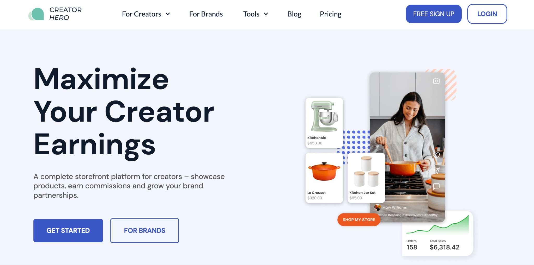 Creator Hero is a commerce platform that enables influencers to build personalized storefronts where they feature and recommend your products. For brands, it provides a centralized environment to monitor which creators are actively promoting their catalog and how those storefronts perform in real-time.
