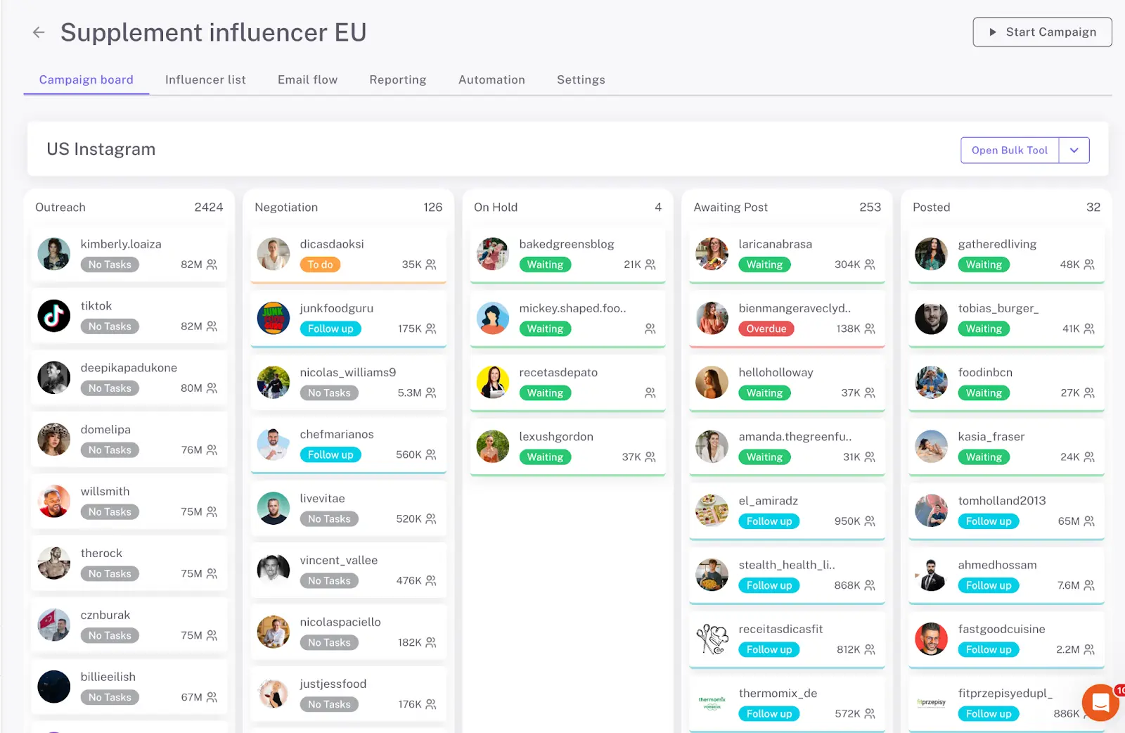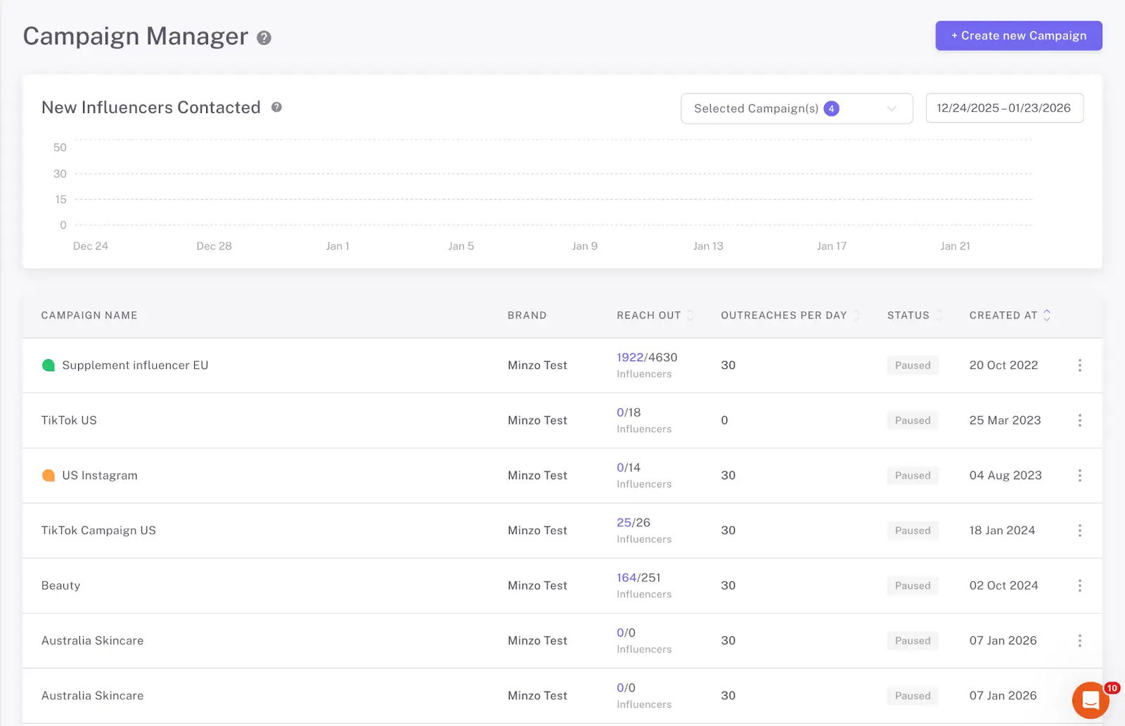The new Campaign Manager is a centralized hub where you can view and manage all influencer campaigns in one place. It consolidates campaign settings, outreach metrics, and Campaign Boards into a structured, campaign-specific layout for easier navigation.