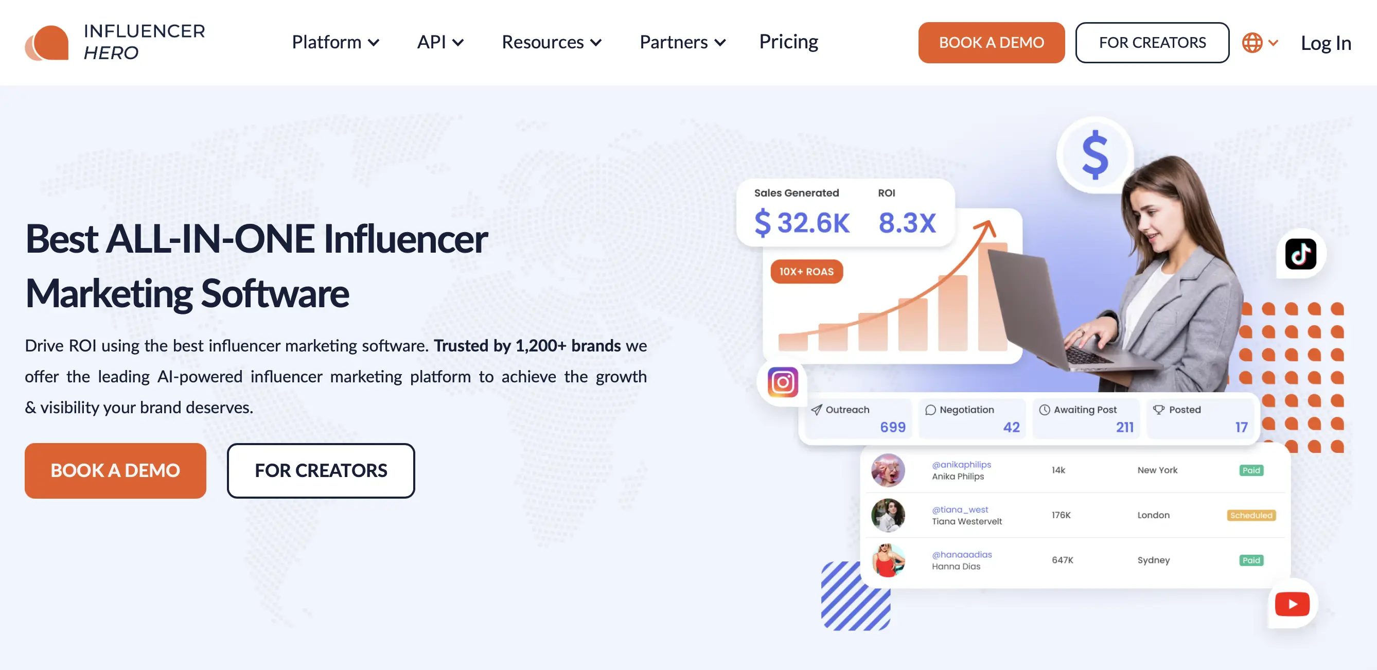 Influencer Hero is an end-to-end influencer marketing software with advanced influencer discovery capabilities across 8 major social media platforms including Instagram, TikTok, YouTube, Facebook, and Pinterest.