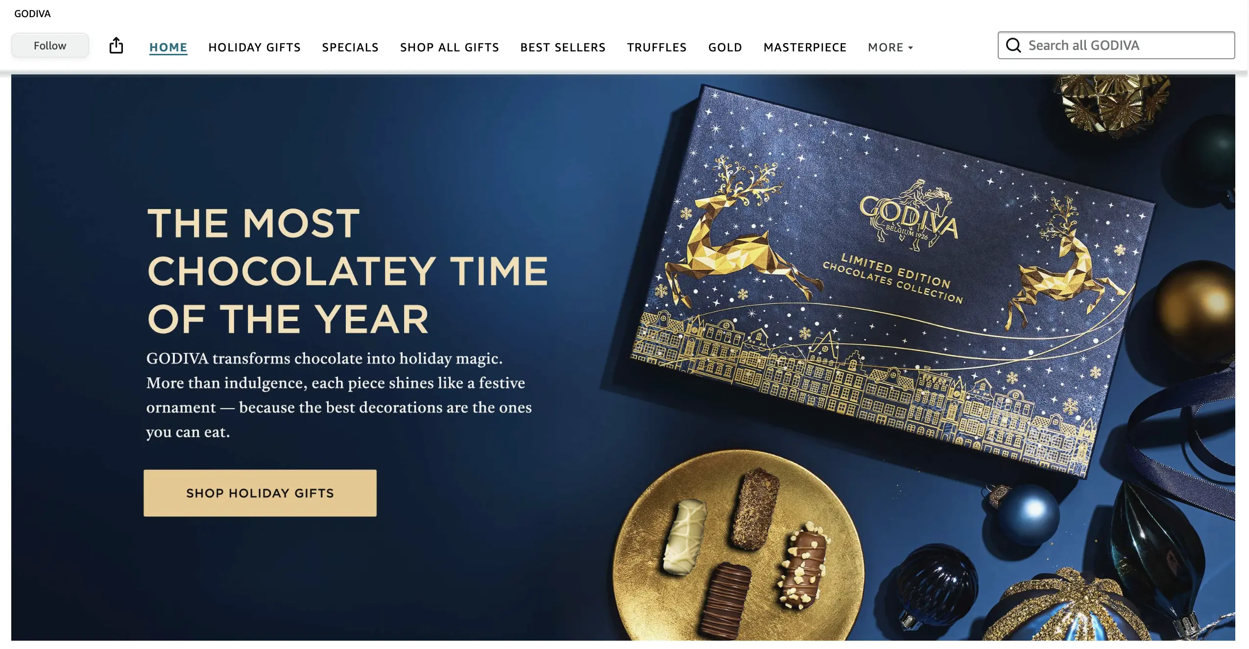 Godiva’s Amazon storefront delivers a premium and intuitive shopping experience that reflects the brand's heritage. The combination of seasonal relevance, clear product information, and visually stunning imagery ensures customers find what they need while enjoying the essence of luxury.
