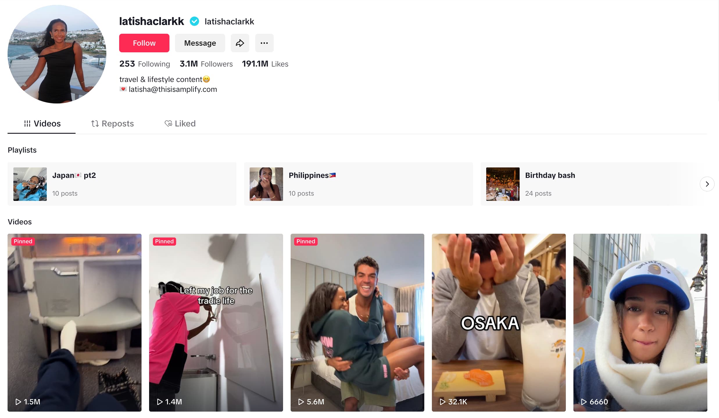 3. Latishaclarkk: Latisha Clark shares captivating travel adventures and lifestyle content alongside her partner, inspiring viewers to explore the world through their unique couple experiences.