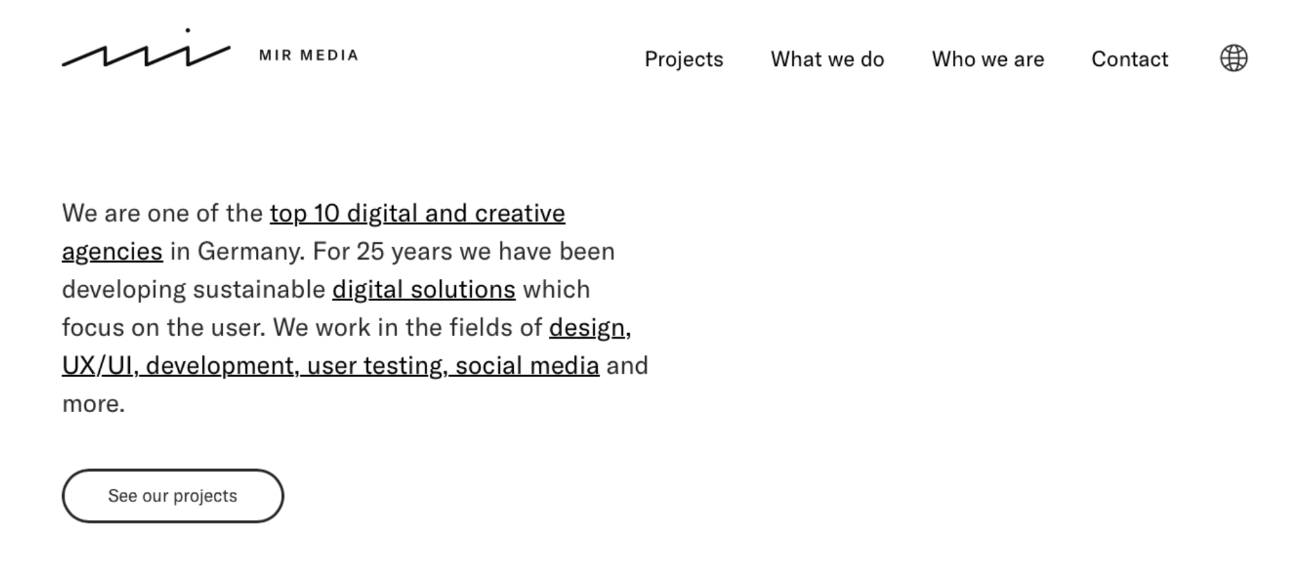MIR MEDIA is a creative digital agency based in Cologne with nearly 25 years of experience guiding brands, institutions, and cultural clients through digital transformation. They are notable for blending design, UX, development, content, and social media in user-centric, sustainable digital solutions.