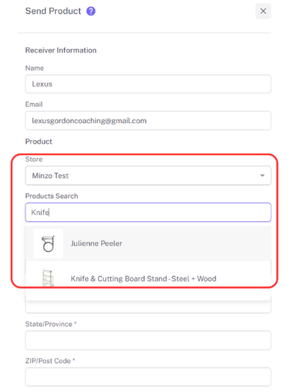 After clicking Send Product, you can search your connected store, select one or multiple products, and adjust quantities if needed.
