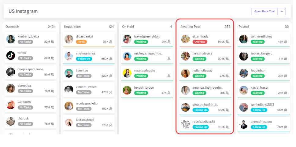 Once the product has been shipped, the creator is automatically moved to the “Awaiting Post” column in your campaign workflow.