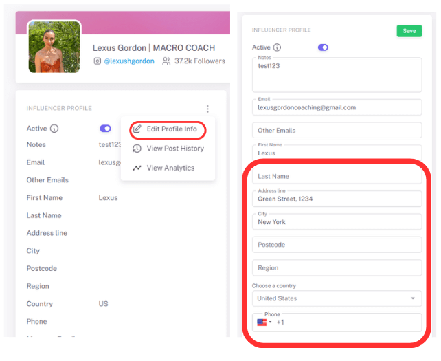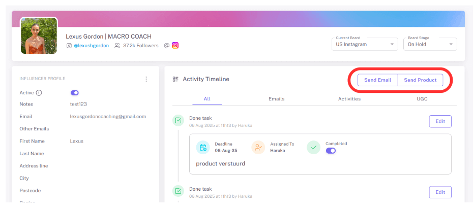 Before sending the product, you simply have to double check the information. Keep in mind that once the influencer shares their email address, their shipping information is automatically added to the Address section of their influencer profile (left side in the CRM).