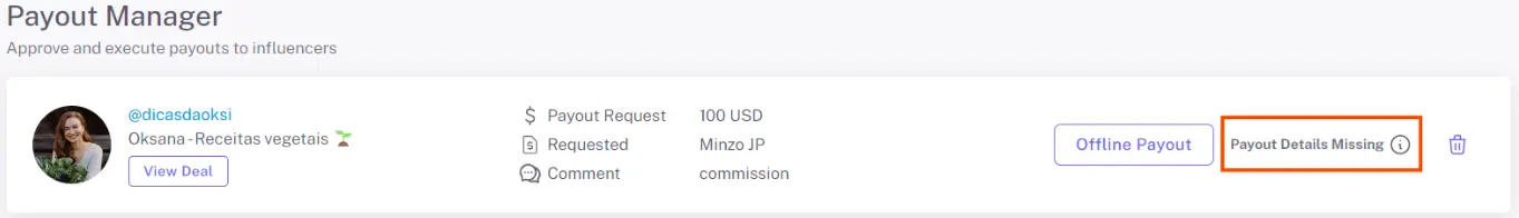 Note: If a creator has not yet submitted their financial information, the system will display a “Payout details missing” alert, preventing payment until the data is provided.