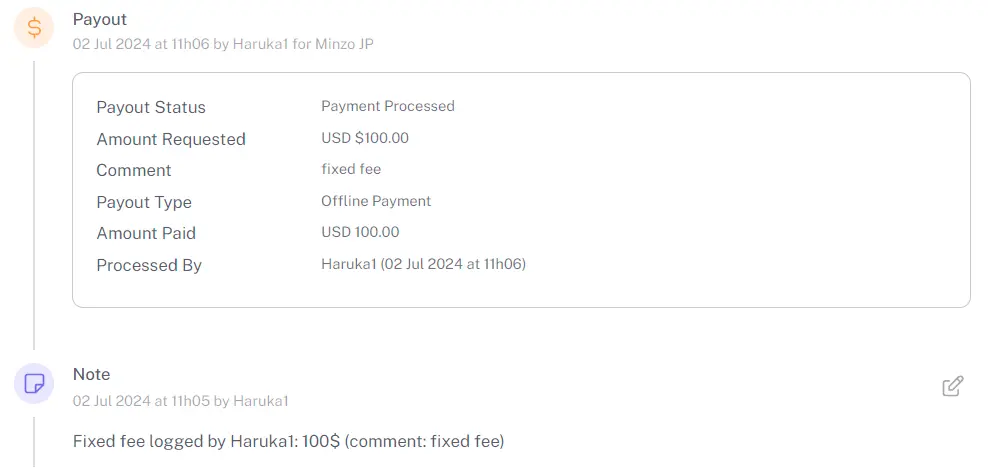 All transaction details are stored on the Influencer’s Deal Page. This log shows you exactly who processed the payment, when it was made, the total amount, and the remaining balance.