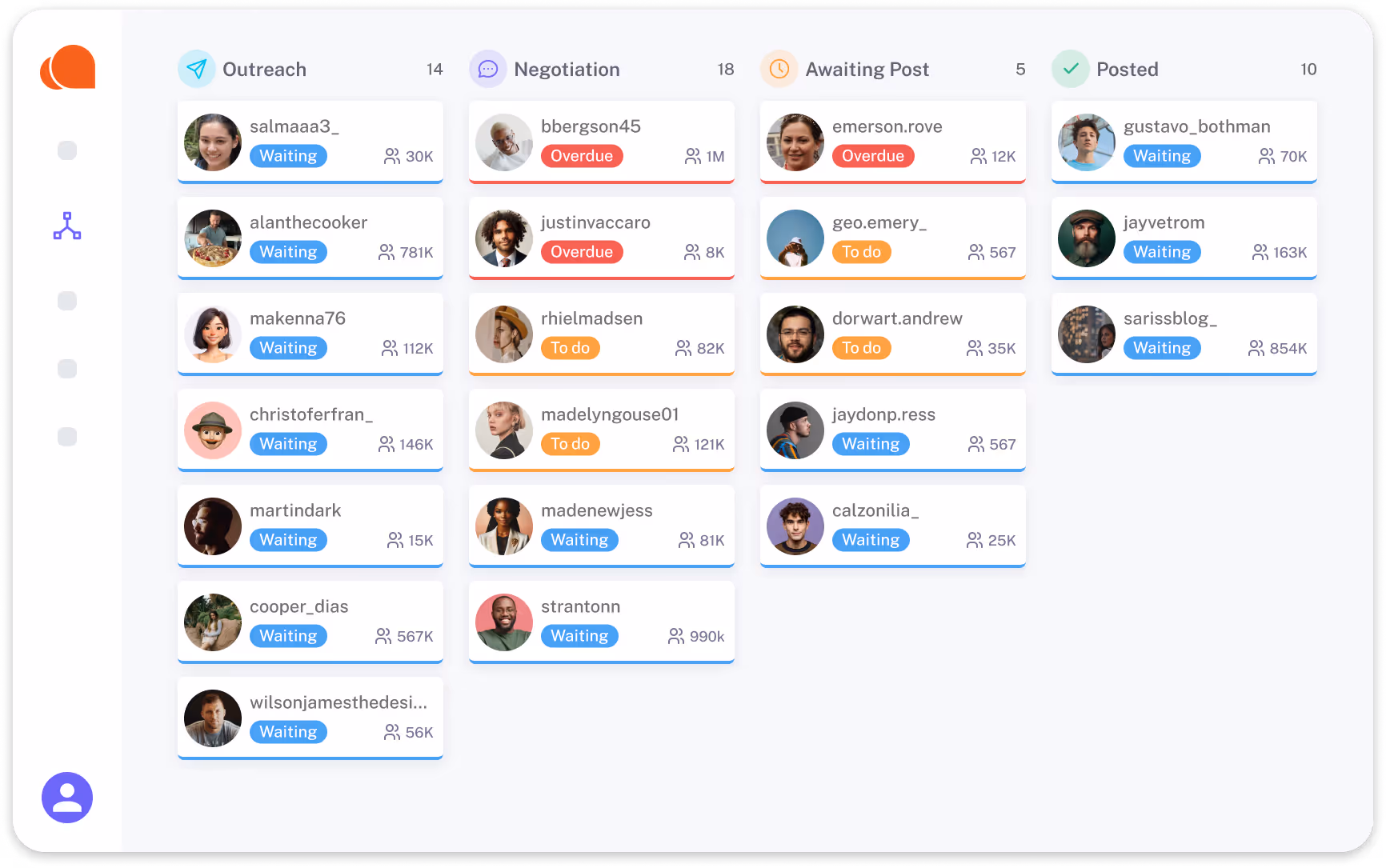 Gestiona todas sus campañas y relaciones a través de un CRM centralizado. Realiza un seguimiento del rendimiento, los pagos, el UGC y los envíos de productos, todo desde una página de ofertas. Deja atrás a su competencia con nuestra plataforma de gestión de creadores TODO EN UNO.
