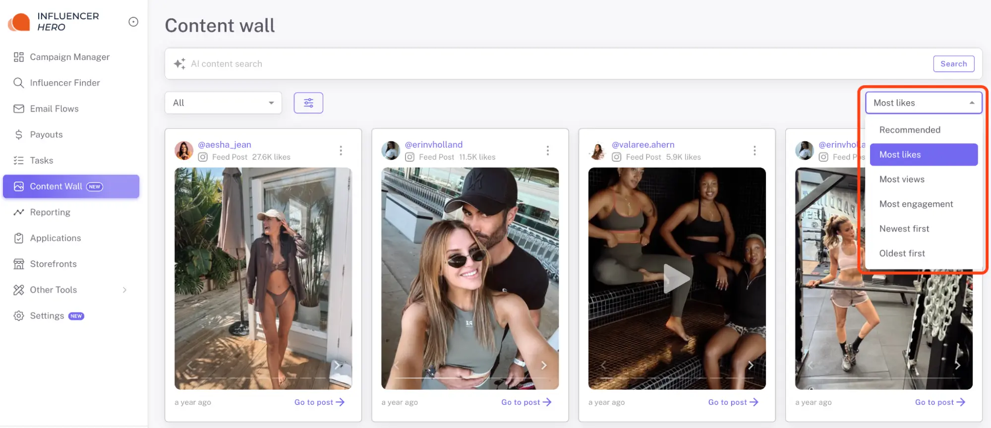 As influencer campaigns grow, so does content volume. The updated Content Wall helps brands centralize influencer content tracking and instantly surface the posts that drive performance.