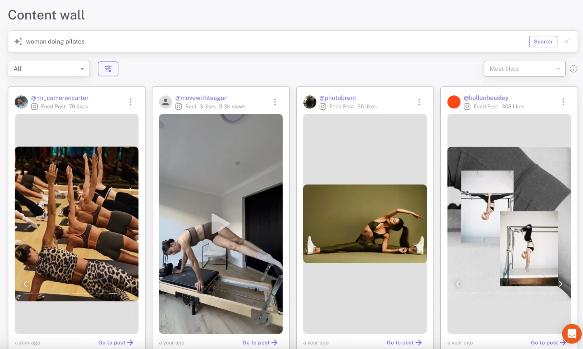 Yes. The Content Wall makes it easy to filter and sort posts by performance metrics, visual quality score, and product visibility. This allows brands to quickly identify high-converting organic content that can be repurposed for paid social campaigns, email marketing, and website creatives.