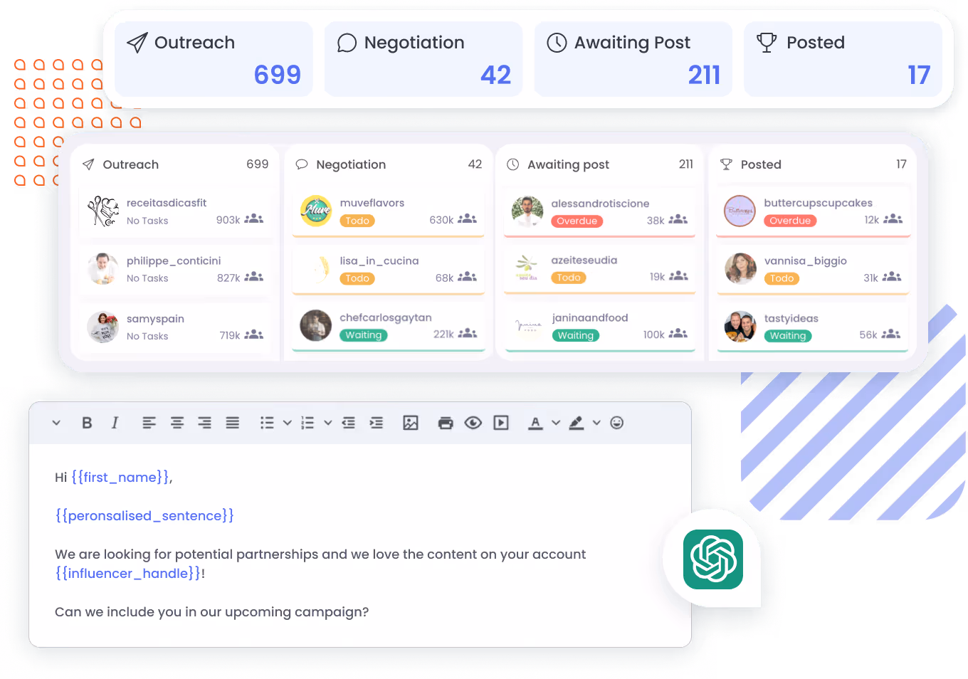 An important part of building up an influencer program is vetting and contacting new influencers. Influencer Hero offers automated drip campaigns to streamline the outreach process, making it hyper-personalized by using an AI-generated personalized sentence and placeholders. Then, to manage new influencers, we offer outreach campaign boards as shown above which make campaign management way easier!