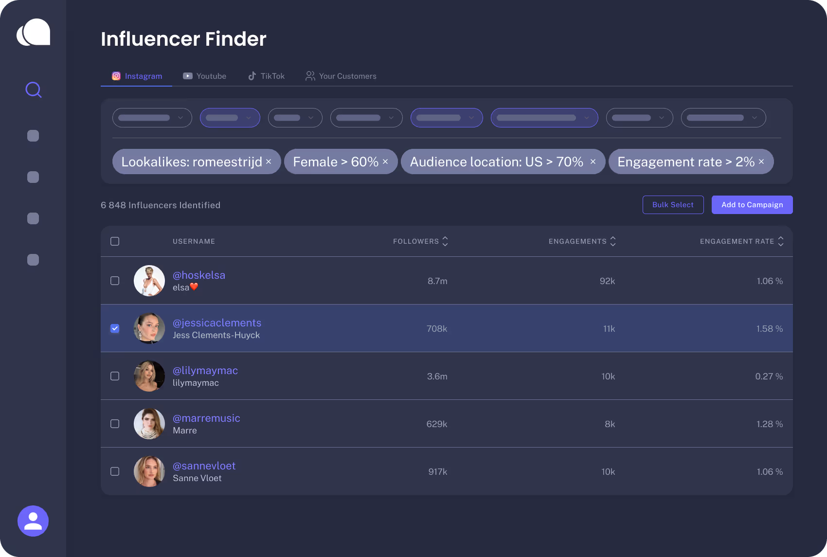 Discover authentic, high-performing influencers from a 450M + global influencer database across Instagram, Tiktok, Youtube & all major social media platforms. Our AI-powered search, with granular 20+ filters and crucial fraud detection, ensures the perfect fit to maximize your campaign ROI.