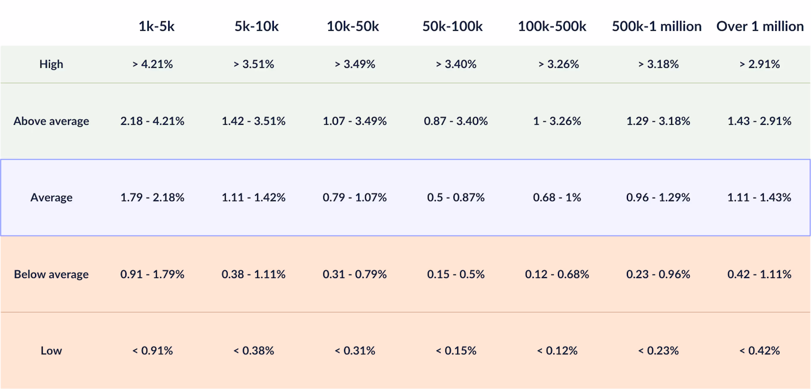 Benchmarks for engagement rates are influenced by multiple elements, with key factors being the platform used, the size of the follower base, and the specific market niche. As a general benchmark: